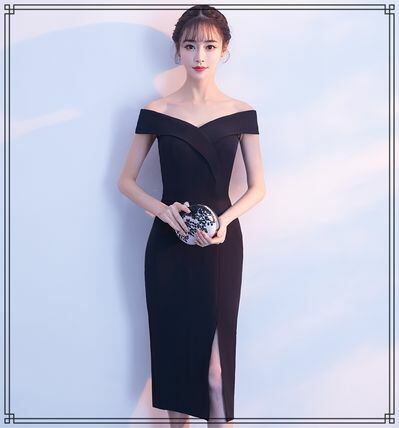 スリットの入ったタイトめラインのシンプルなドレスです。ウエスト切り替えできれいなシルエットに。結婚式やパーティー、二次会などに。