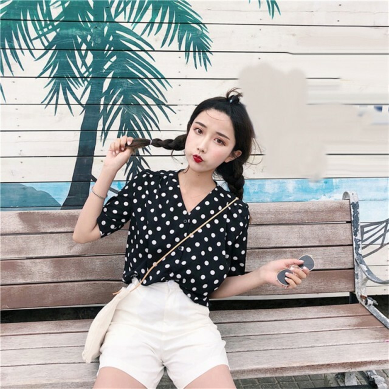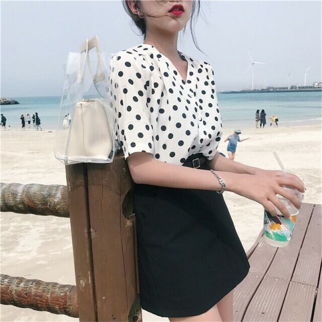 ドット柄がかわいい水玉のVネックです。デニム等、カジュアルスタイルとの相性が良い一枚です 。