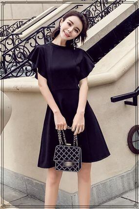 フリル袖がポイント。シンプルでかわいい 黒のフレアワンピースです。