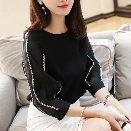 通勤やオフィスシーンにもピッタリのブラウス。ステッチラインがアクセントになり、透け感で女性らしさも。七分袖なのでシーズンレスでお使い頂けます。