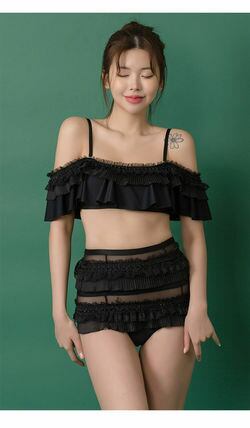 ワンショルダーフリルのハイウエストビキニです。フレアがバストのボリューム感を演出したり、お腹周りのラインをぼかしてメリハリのある印象を叶えてくれます。