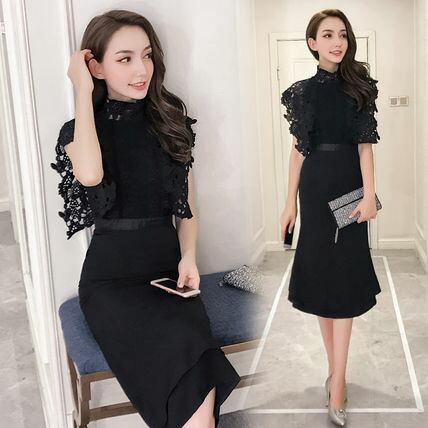 トップが総レースで可愛いデザインです。レースで程よく二の腕をカバー、タイトスカートなのですっきり細見えアイテムです。