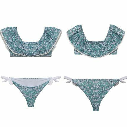 フラワーペイズリー×フリルオフショルダーが可愛いビキニです。爽やかなウォーターグリーンカラーで、甘くなりすぎず着られます。