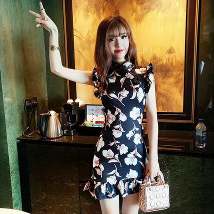 美シルエットで華やかなミニワンピース。エレガントなフラワープリントにチャイナカラーがおしゃれなアクセント。