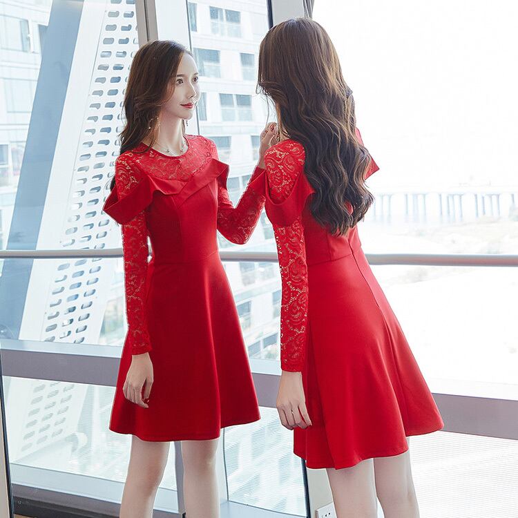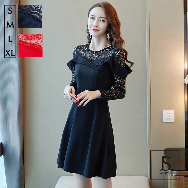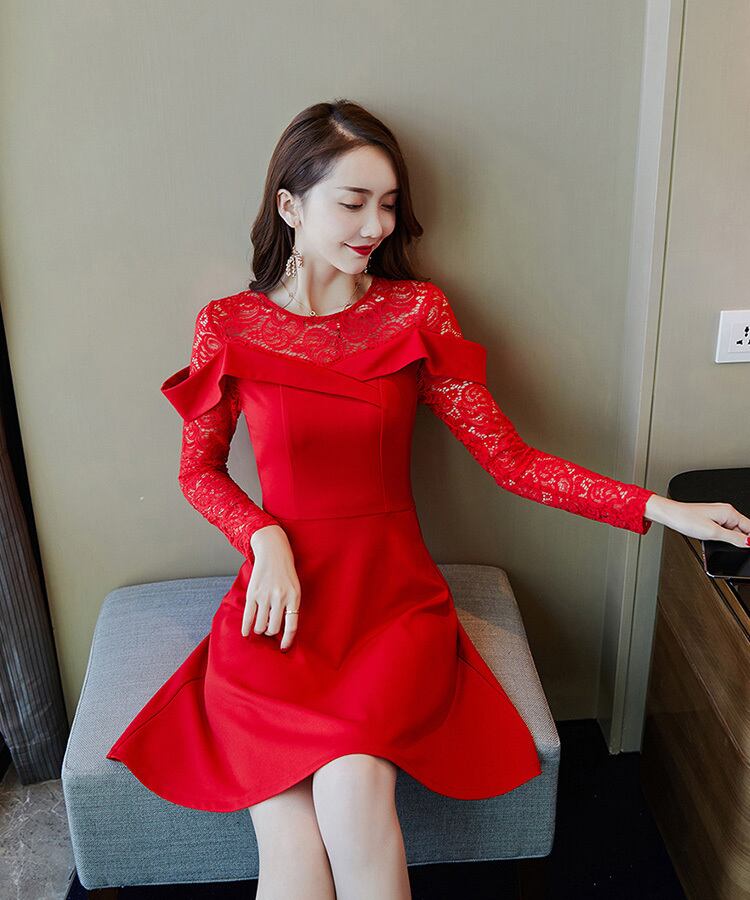 レース切替ワンピースです。肩周りレースと袖の透け感で見栄えが良く上品かつ女性らしい印象に。シースルーデザインとフリル施しが非常にマッチした一枚です。程良い肌見せで華やかに仕上がる大人ワンピース、パーティーなどのシーンで楽しめます。
