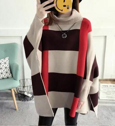 ゆったり 配色 ビッグチェック柄 ドルマンニット 上品
