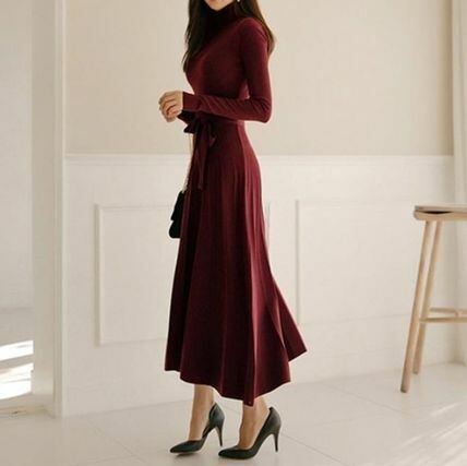 ウエストマークのリボン付きワンピースです。シンプルでこっくり秋冬カラーのニットプリーツワンピです。デートや女子会にもおススメです。