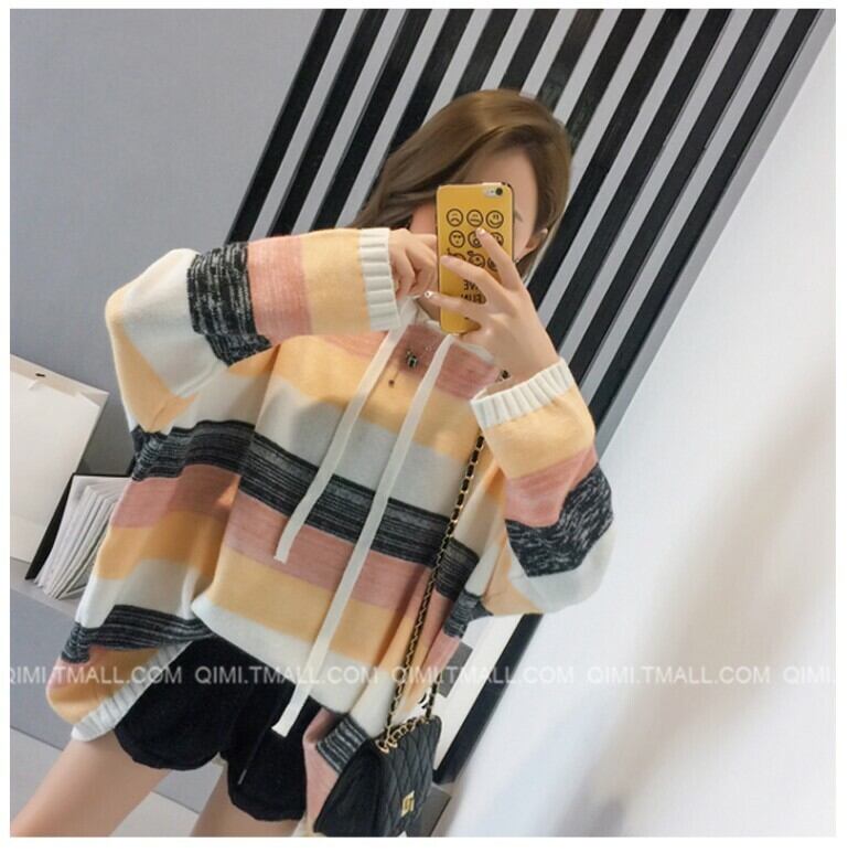 キレイめカラーのストライプ柄ニットセーターです。ダボっと大きめなシルエットが女性らしい雰囲気を出してくれます。薄い色のボトムスと相性バッチリです。