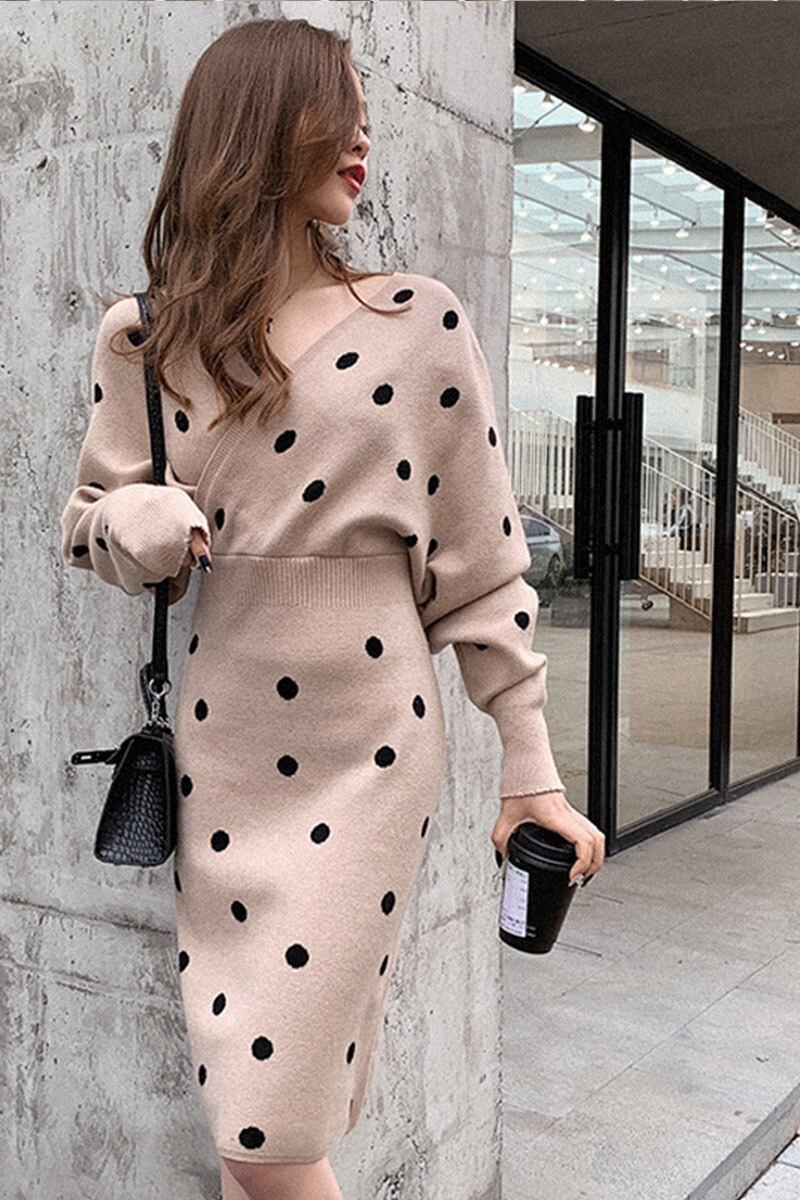 ニットワンピース Vネック 長袖 ウエストマーク ドット柄