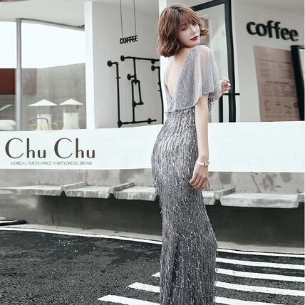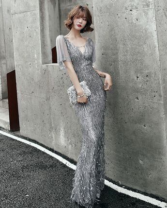 ふんわりケープ袖のゴージャススレンダーロングドレスです。