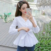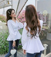 ペプラムデザインが可愛いVネックトップスです。ウエストからふんわりと広がるフレアシルエットで可愛く体型カバー。カジュアルでキレイめなコーディネートに使えます。
