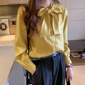 光沢があり華やかなサテン素材のボウタイブラウスです。