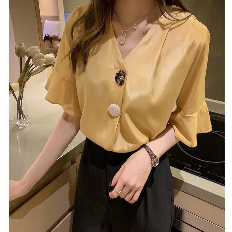 大きな丸ボタンがアクセント、キュートさが増すVネックのブラウスです。
