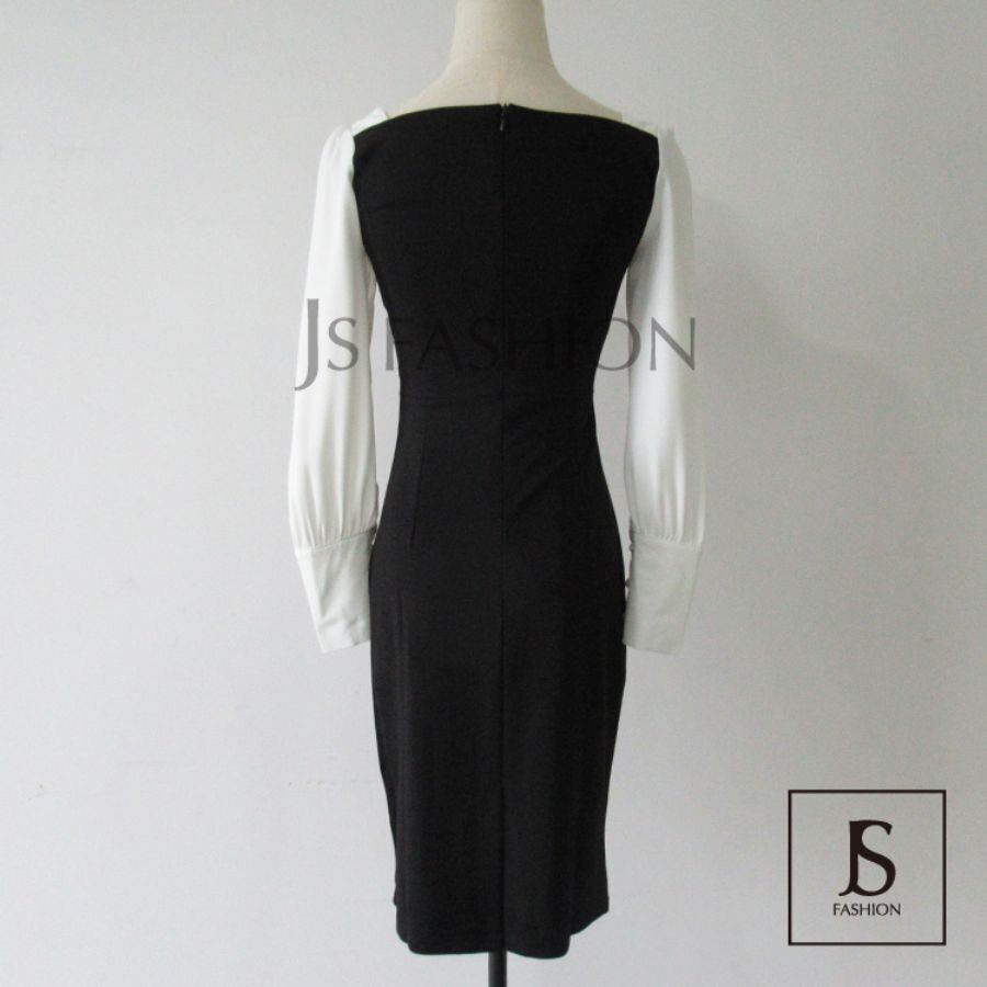 エレガントなパーティードレスです。ボリューム袖とタイトラインでメリハリのある美シルエットを演出します。