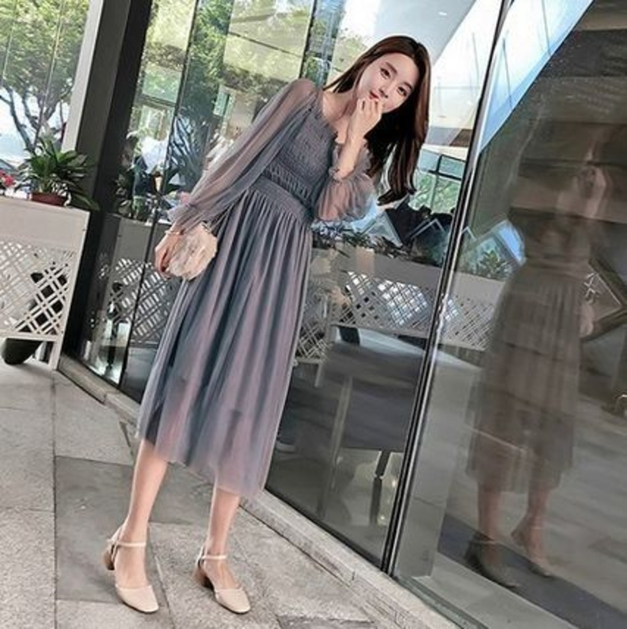 胸元のシャーリングやフレア袖。ふわっとしたシルエットの透け感。女の子の可愛いをギュッと詰めこんだデザインです。結婚式や二次会、パーティーやディナーなど様々なシーンで使って頂けるワンピースドレスです。